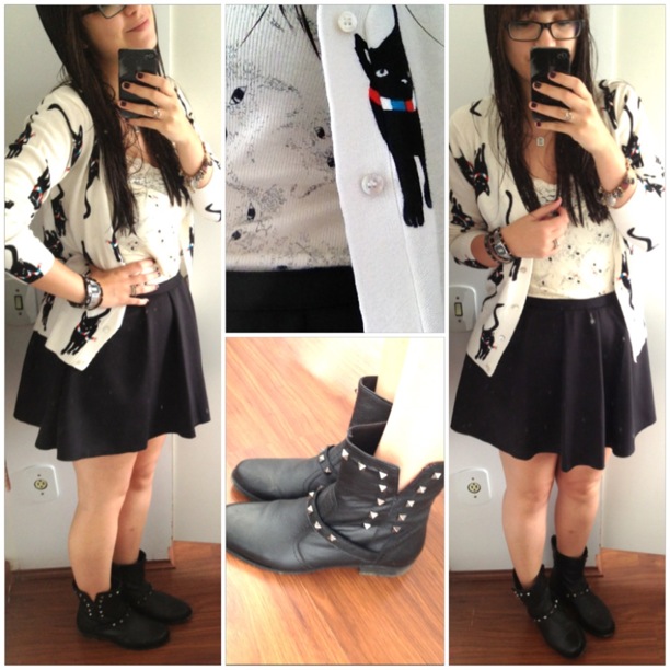 exceto pela botinha (lá da C&A, coleção da 284), o look é todo Farm. misturei casaqueto e camiseta de gatinhos, com a saia preta de pregas macho. e reparem bem que o casaqueto é cheio de gatos pretos.