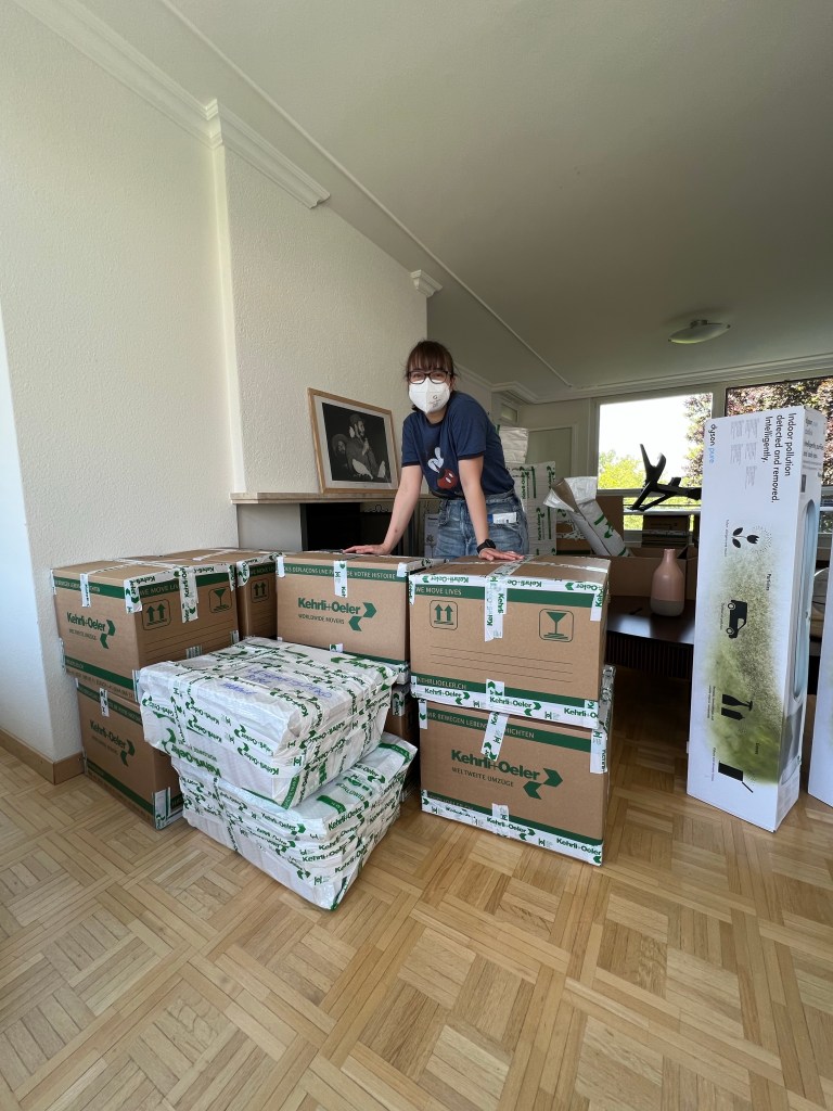 Tivemos que procurar um lugar provisório pra morar, planejar os encerramentos de contratos, vender o Bolinha… enfim, viver todo o caos que é o processo de mudança no meio do meu semestre letivo que foi super intenso enquanto o marido estava atolado de trabalho. Graças a Deus, meus pais puderam (finalmente!!!) vir pra Suíça nos ajudar na preparação da mudança, e a gente nem imaginava o quão importante seria, de fato, todo o trabalho que eles fizeram de empacotamento e arrumação. Eles ficaram o mês de maio todinho com a gente, e quem dera pudessem ter ficado mais pra arrumar mais coisas!!